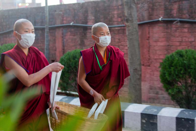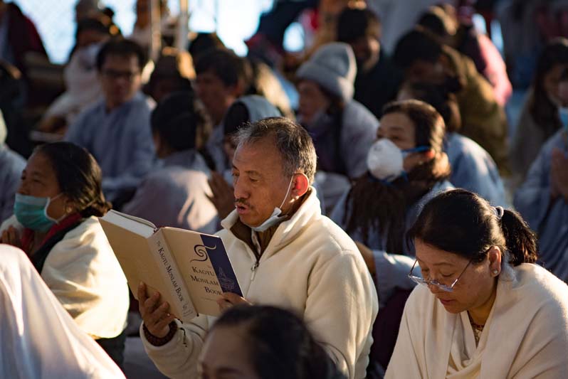 Shortly before 6.00am, HE Goshir Gyaltsab Rinpoche arrived to give the first set of Sojong vows of the 37th Kagyu Monlam. The sangha huddled in their heavy winter cloaks against the cold. Laypeople wore white as a sign that they were holding Mahayana Sojong vows for the day. As the sun rose, the mist dissipated and slowly it began to get warm.