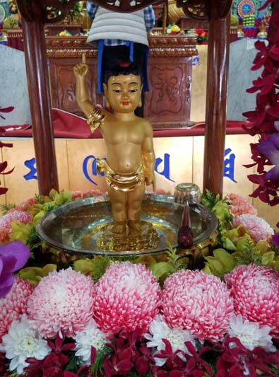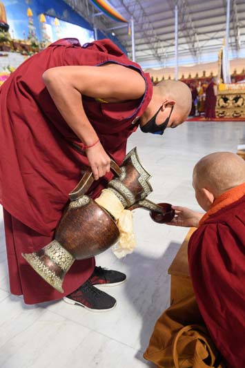 6. It contains a golden image of Shakyamuni Buddha as an infant. He stands in a bowl of saffron water, which will be used to bathe him as part of the Twenty Branch Monlam.