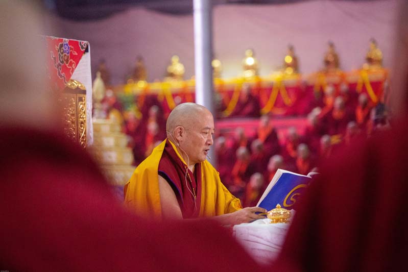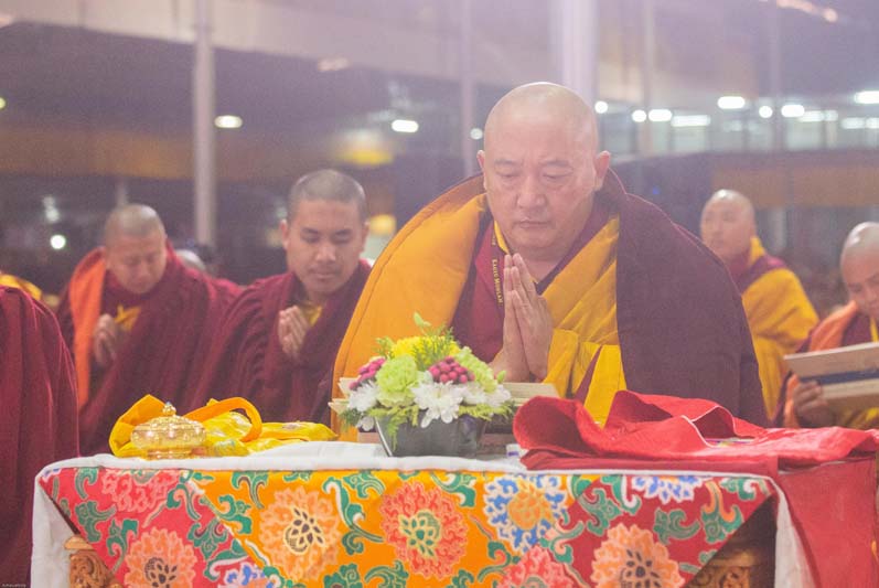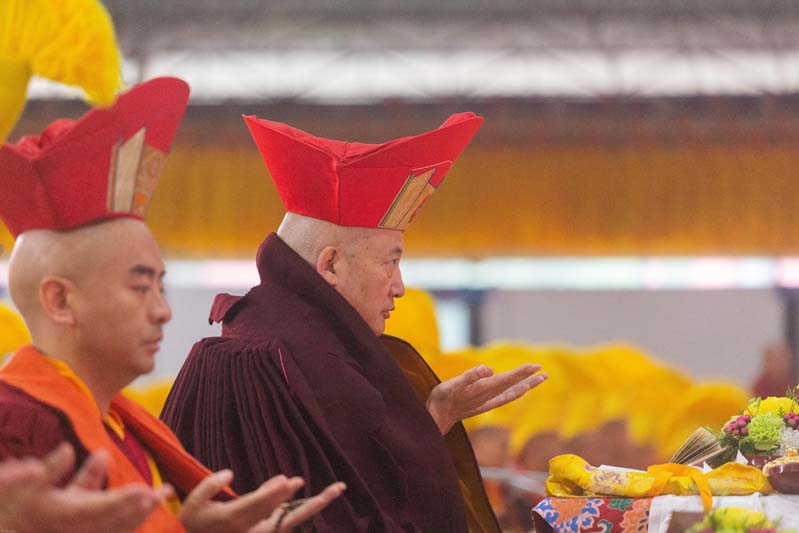 4. Gyaltsab Rinpoche then turns around, to face the Buddha image and leads the first session of the 37th Kagyu Monlam. It’s a cold morning and he puts on his winter cloak – the dhagam.