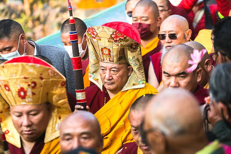 The spectators, monastic and lay people alike, lined up along the “outer kora,” the upper circumambulation path running along the outer rim of the temple complex. Soon the other-worldly pleading of the gyalings signaled the start of the procession. Through the bodhi trees and across the complex, one could see the majestic procession making its way up the stairs from the temple’s lower level, to the upper kora path. Rays from the still-low sun filtered through wafting clouds of incense.