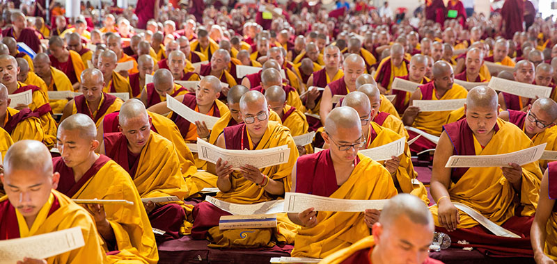 The Reading of the Kangyur, the Tibetan translations of the original teachings of the Buddha, occupied the second half of the morning session on the fifth day of the 35th Kagyu Monlam. The Reading is a quintessential collective effort by the assembled Monlam, with every Tibetan-literate person taking part. This connection to the words of the Buddha also resonates, for Dharma practitioners, as a deep expression of faith and devotion, with many a lay reader shedding tears merely to be able to hold the precious texts.