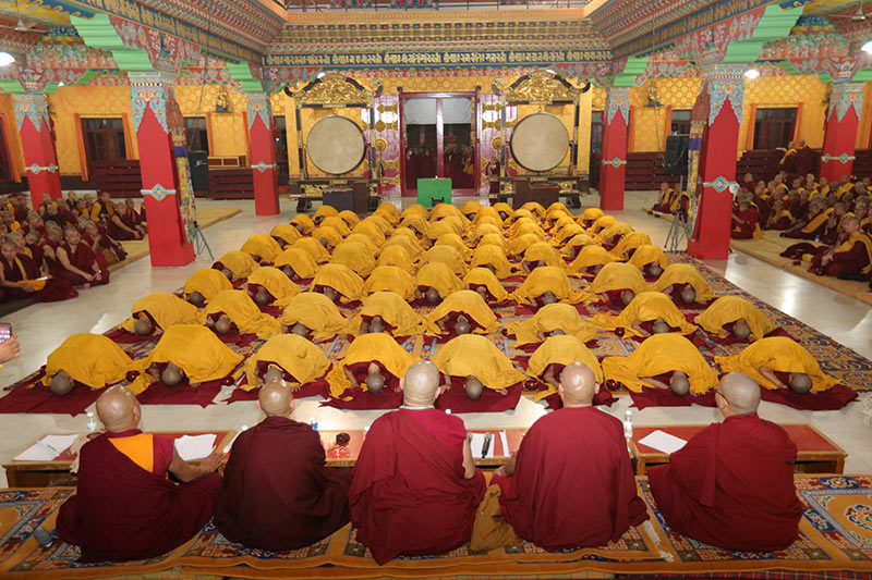 Each year, before the Monlam begins, the monks and nuns are put through their paces in front of a panel of judges. In 2014, at the 32nd Kagyu Monlam, the examination became an annual competition, with prizes awarded in two categories:  gelong [fully ordained monks] and getsul and getsulma [novice monks and nuns]. In the latter category monks and nuns compete against each other equally.<br>