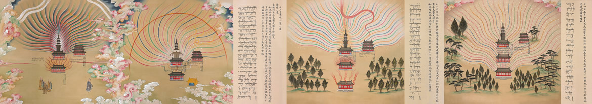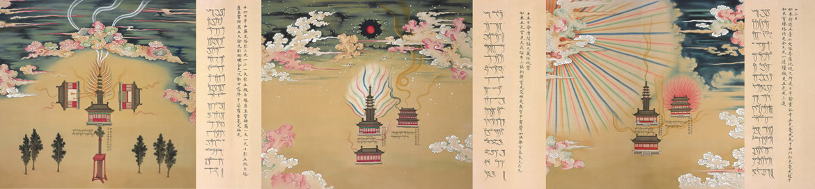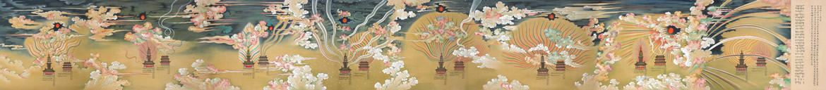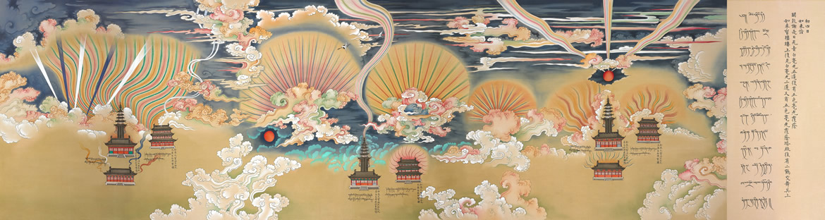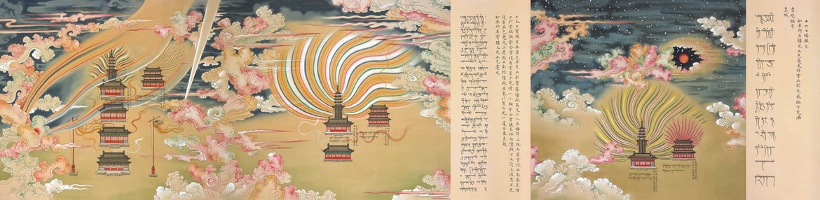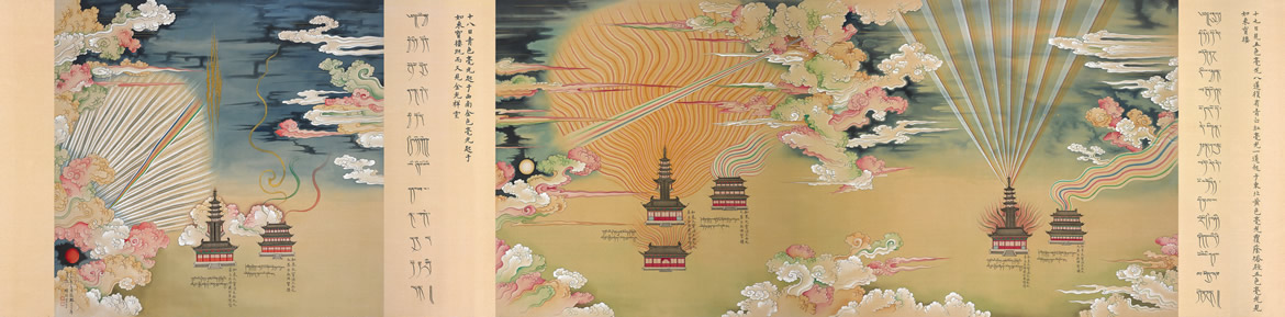 50 metres long and painted on silk, the scroll depicts scenes of miraculous signs that took place over twenty-two days during the performance of the ritual. These are described in Chinese, Arabic, Uighur, Tibetan and Mongolian.