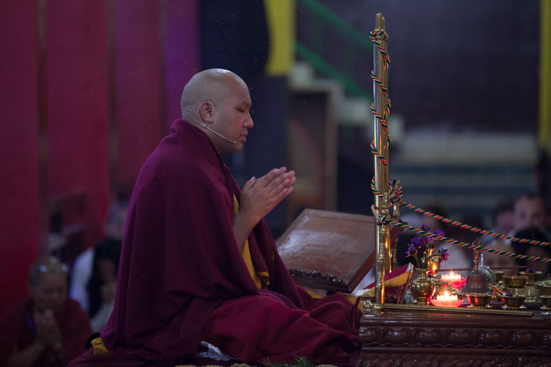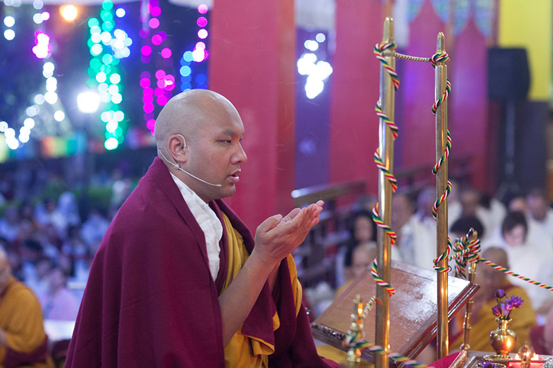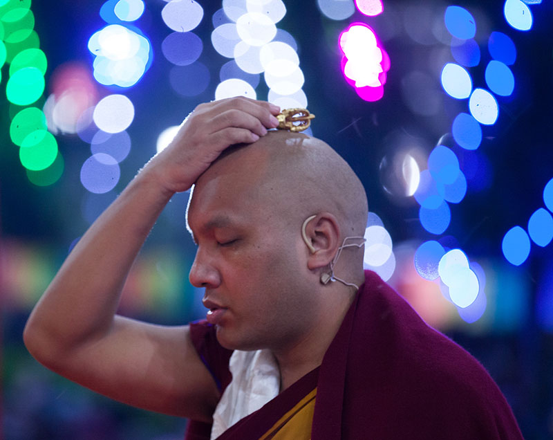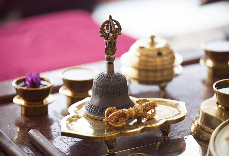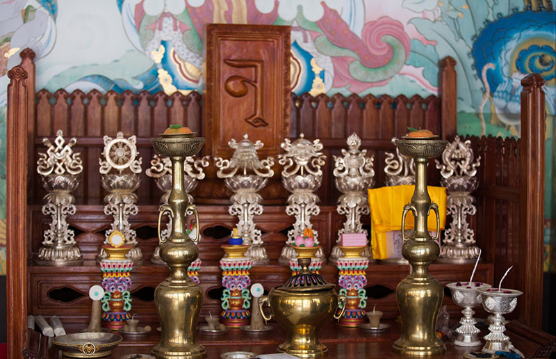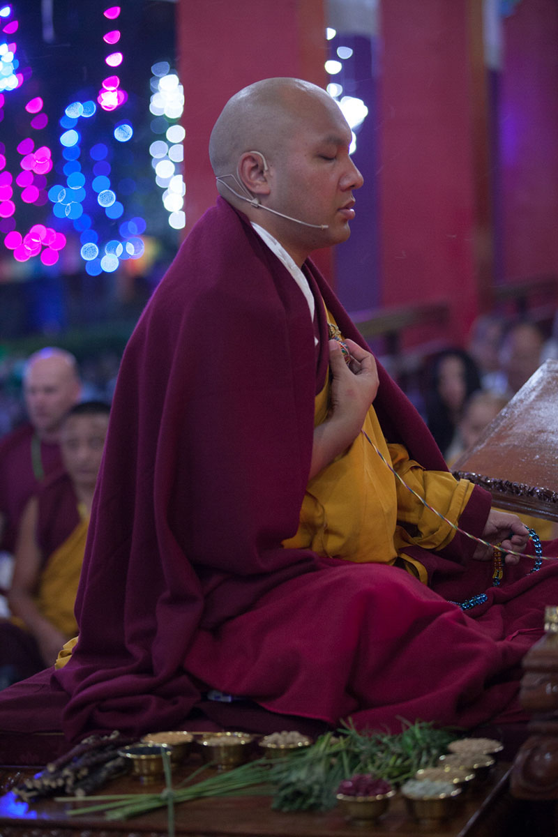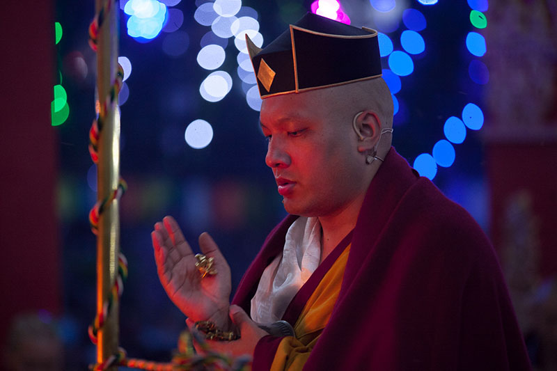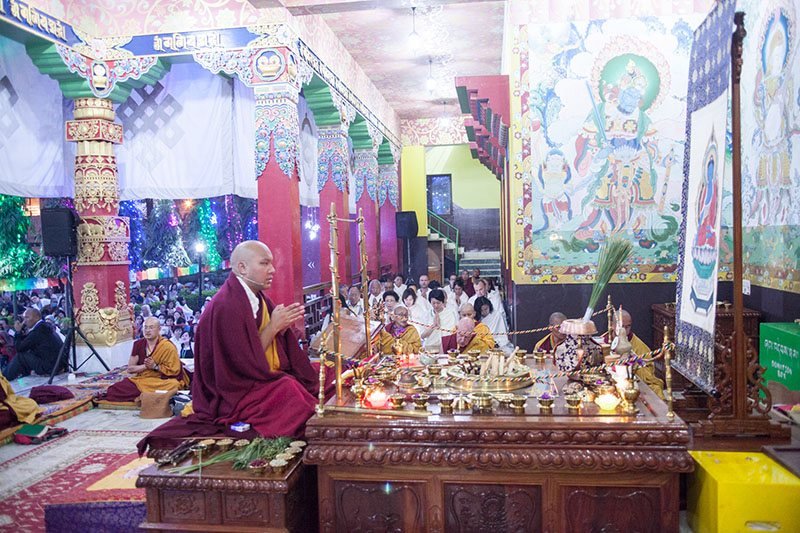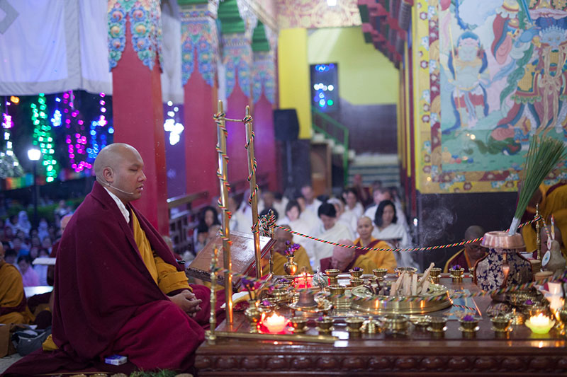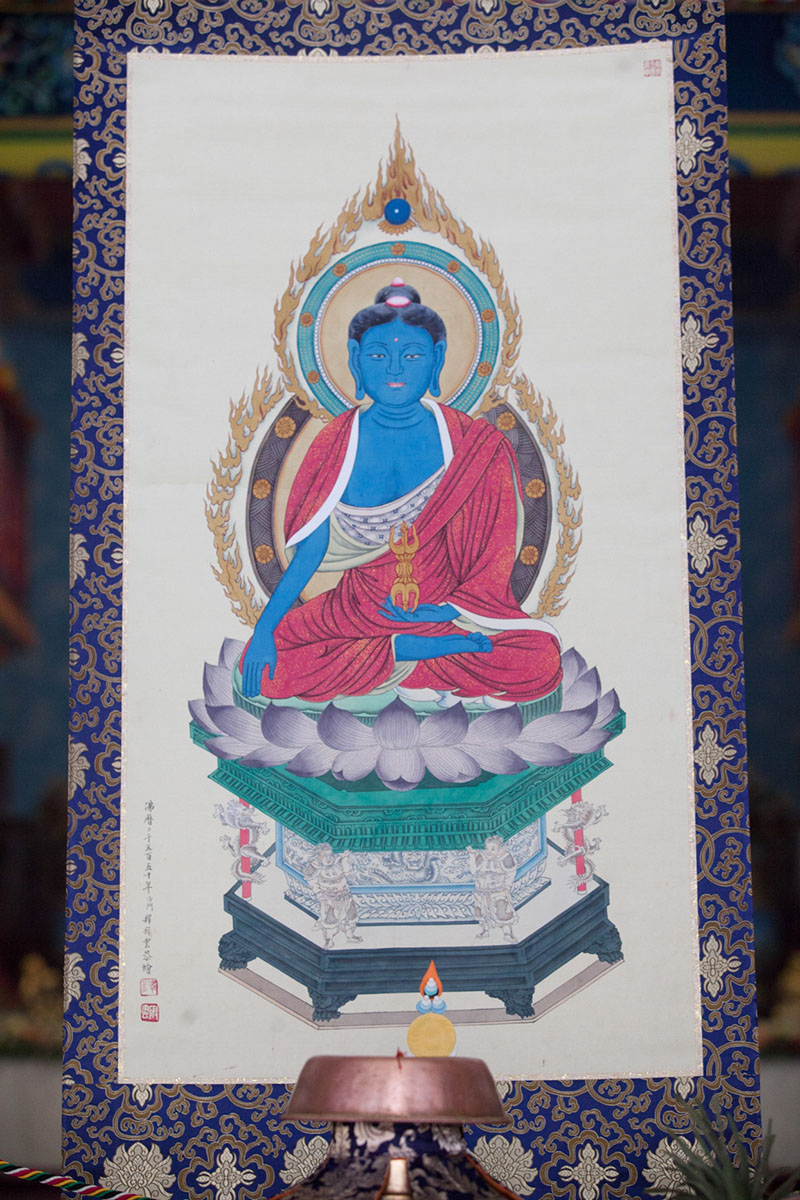 The special Akshobhya shrine is set up on the porch outside the Tergar Monastery Shrine Room. His Holiness wears a white kata around his neck during the ritual.