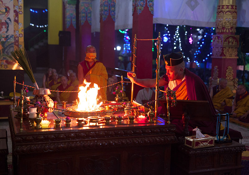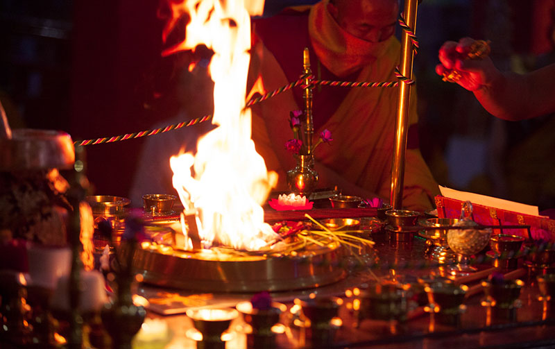 Using long tongs the Gyalwang Karmapa carefully adds offerings to the small fire on the shrine.