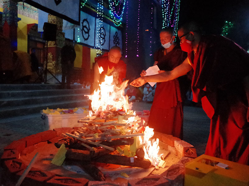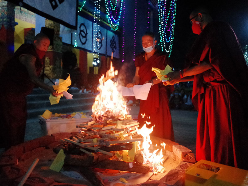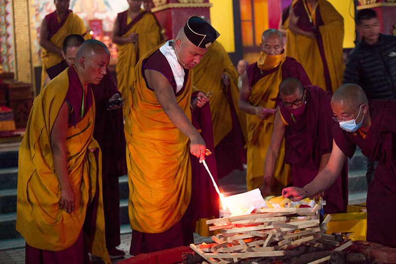The  Gyalwang Karmapa leaves the shrine and goes to light the bonfire.