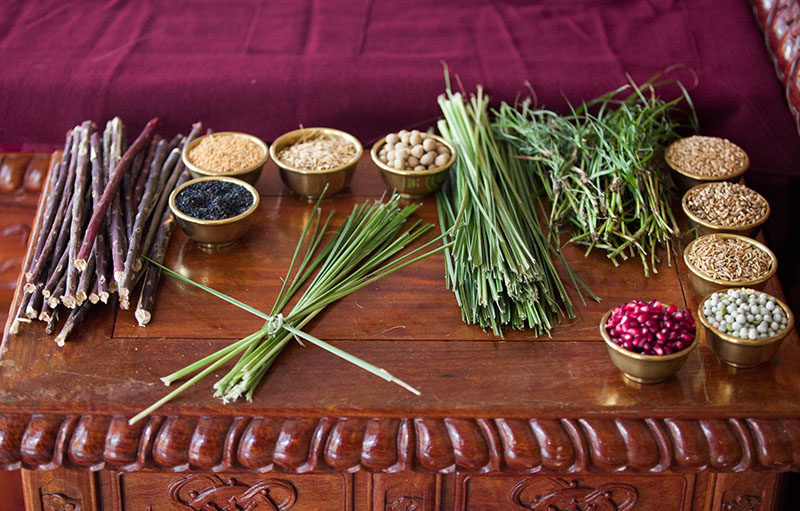 The eight auspicious symbols - the sacred knot; the Dharma wheel; the lotus; the victory banner; the parasol; the vase; the conch; the golden fish- will be offered during the ritual