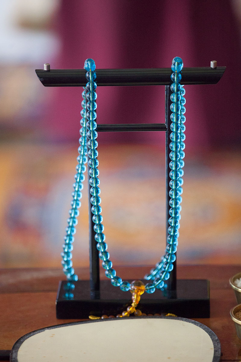 Special blue mala that His Holiness uses for the ritual; blue is the colour of Akshobhya Buddha.