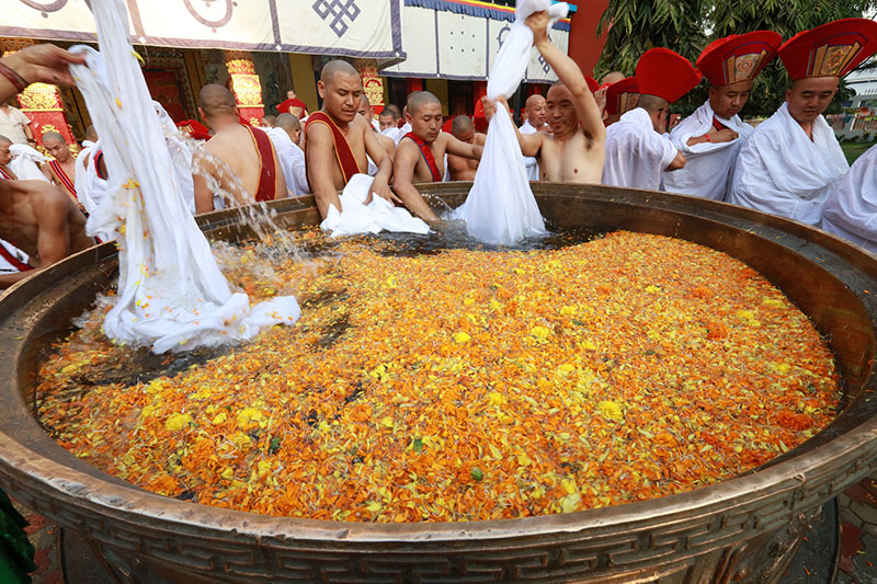 1. After slowly circumabulating around Tergar in a single-file line, they return to the front of the shrine where they each remove the dry cloth and dip it into the large urn filled with water and yellow and orange carnation flower petals.