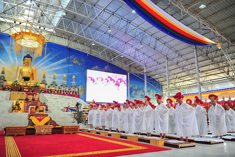 6. Once they reach the stage, they line up in rows seated to Gyaltsap Rinpoche’s left, and take their seats sat facing the other Sangha and recite Offerings to the Gurus. This lineage of great practitioners continues the revival of the cotton-clad tradition.