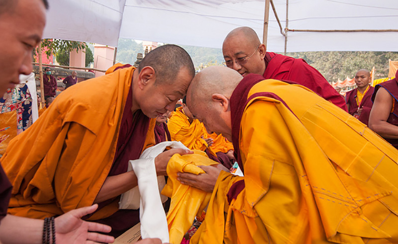 7. Gyaltsab Rinpoche greets Muktsang Rinpoche from Penor Rinpoche’s Palyul monastery.
