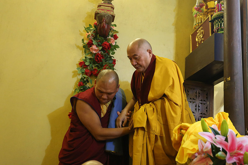 10. Rinpoche is assisted down from the dais by his attendant.
