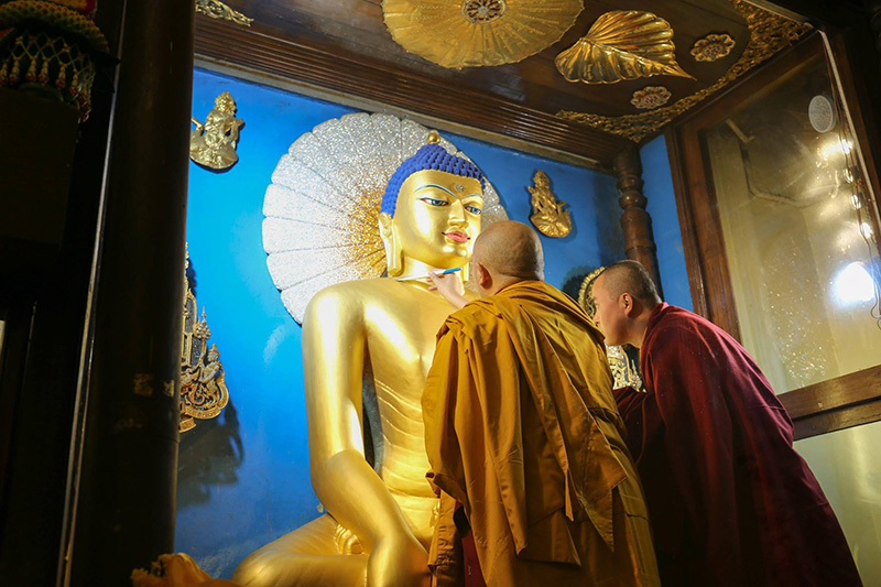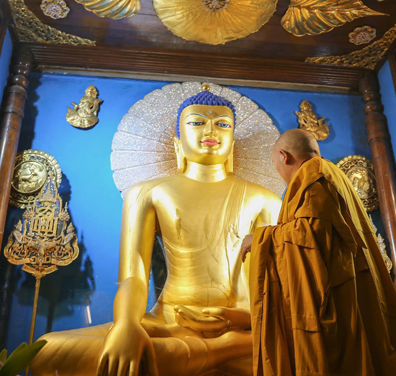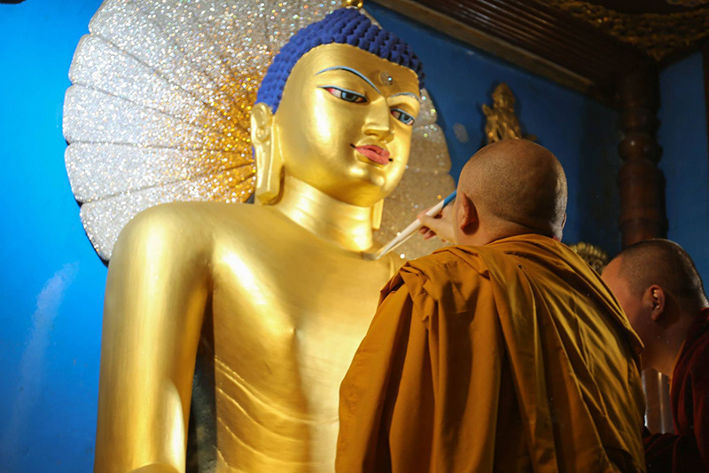 Each year, as part of the offerings during the Kagyu Monlam Chenmo, the Golden Buddha image in the main shrine room at the Mahabodhi Stupa is painted.