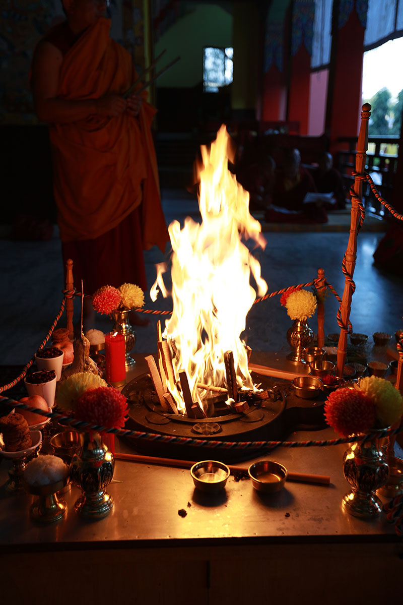 སངས་རྒྱས་མི་འཁྲུགས་པའི་ཉམས་ལེན་བྱ་རྒྱུ་དེ་གང་གི་སྤྱོད་པའམ་རྣམ་ཐར་ལ་སློབ་དགོས་པ་ཡིན། རང་རེ་རྣམས་ནས་སྣང་མེད་དུ་མི་འཇོག་པར་རང་གི་རྒྱུད་ཚོད་ཀྱིས་ཇི་ལྟར་ཉམས་སུ་ལེན་ནུས་པ་ཚུལ་བཞིན་སྒྲུབ་དགོས། མི་འཁྲུགས་པའི་ཞིང་ཁམས་སུ་སྐྱེ་ བར་དགེ་བའི་རྩ་བ་ཁྱད་པར་ཅན་ཞིག་དགོས་པ་ལས་དེ་མིན་སྐྱེ་དཀའ་བ་ཡིན། དེས་ན་མཐུན་པའི་རྐྱེན་བསྔོ་བ་དང་། སྨོན་ལམ་ལ་བསྟེན་དགོས་པ་ཡིན། བསྔོ་རྒྱུའི་དགེ་བ་ཡོད་པ་ལ་བསྔོ་བ་དང་། བསྔོ་རྒྱུའི་དགེ་བ་དམིགས་བསལ་མེད་ཀྱང་སྨོན་ལམ་འདེབས་ཆོག་པ་ཡིན། དེར་བརྟེན་སྨོན་ལམ་འདེབས་རྒྱུ་ཤིན་ཏུ་གལ་ཆེན་པོ་ཡིན། དེས་ན་ལོ་བསྟར་ཆགས་སུ་དཔལ་༸རྒྱལ་དབང་ཀརྨ་པ་མཆོག་ནས་གཤིན་པོ་རྗེས་འཛིན་ཕྱིར་བྱང་སྲེག་མཛད་མུས་ཡིན་ཡང་། འདི་ལོ་མགོན་པོ་མཆོག་རྐྱེན་སྣ་ཚོགས་ལ་བརྟེན་བཀའ་བརྒྱུད་སྨོན་ལམ་ཐེངས་སོ་ལྔ་པར་ཞབས་སོར་བསྐྱངས་མ་ཐུབ་པར་བརྟེན་ ཨ་འཛིན་རིན་པོ་ཆེ་ནས་བྱང་སྲེག་མཛད་པའི་ཐུགས་འཁུར་བཞེས། དེ་ཡང་ཕྱི་ལོ་ ༢༠༡༨ ཟླ་ ༣ པའི་ཚེས་ ༣ ཉིན། ཕྱི་དྲོ་ཆུ་ཚོད་ལྔ་པའི་ཐོག་དབུ་འཛུགས་ཀྱིས་སྲོད་ཀྱི་དུས་ཚོད་བརྒྱད་པའི་བར་ཡོངས་དགེ་གཏེར་སྒར་དགོན་གྱི་སྒོ་མཆོར་མདུན་དུ་སྔར་སྲོལ་ལྟར་སྐྱབས་རྗེ་ཨ་འཛིན་རིན་པོ་ཆེ་དབུ་བཞུགས་ཀྱིས། དེ་སྔ་མི་འཁྲུགས་པའི་བསྙེན་མཚམས་སུ་བཞུགས་ཟིན་པ་རྣམས་དང་ལྷན་དུ་དུས་ཡུན་ཆུ་ཚོད་གསུམ་ཙམ་རིང་མི་འཁྲུགས་པའི་ཆོ་ག་དང་འབྲེལ་བའི་སྒོ་ནས་ཚེ་ལས་འདས་པ་གནས་ར་ཀརྨ་ལྷུན་གྲུབ་དང་། ཨ་ནེ་རྨེའུ་རོང་གི་མ་རྒན་སུན་ཊྲུན་ཧག་གཉིས་ཀྱིས་གཙོས་པའི་སེམས་ཅན་ཚེ་ལས་འདས་ཚད་རྣམས་རྗེས་འཛིན་གྱི་ཐུགས་སྨོན་དྲག་པོ་དང་བཅས་དགོན་པའི་མདུན་ཕྱོགས་སུ་བྱང་ཤོག་སྲེག་པར་མཛད་པའི་གནས་ཚུལ་སྙིང་བསྡུས་སུ། བསྟན་འཛིན་རྣམ་རྒྱལ་ནས།