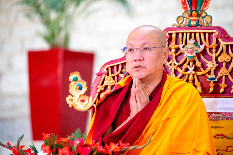 ༸སྐྱབས་རྗེ་རིན་པོ་ཆེ་མཆོག་སླར་ཡང་བཞུགས་ཁྲིར་འཁོད་རྟིང་ཆོས་ཐུན་སྔ་མར་མཚན་སྨོས་པ་དང་འགྱུར་ཕྱག་གི་དོན། དེ་བཞིན་གཞུང་དོན་དངོས་མན་ངག་གཞན་ལ་འདོམས་པར་དམ་བཅའ་བའི་སྐབས་ལ། གནས་ལུགས་ཕྱག་རྒྱ་ཆེན་པོ་ཉམས་སུ་ལེན་པའི་སློབ་མ་སྣོད་དང་ལྡན་པ་ལ་མཚན་ཉིད་དམ་ཡོན་ཏན་བཞི་ལྡན་དགོས་གསུངས་པ་ལས་དཀའ་བ་སྤྱད་པ། བླ་མ་ལ་གུས་པ་གཉིས་ཆོས་ཐུན་དང་པོར་རྒྱས་འགྲེལ་གྱི་སྒོ་ནས་བཀའ་ཁྲིད་ལེགས་པར་གྲུབ་སྟེ། ཆོས་ཐུན་གཉིས་པར་གསུམ་པ་སྡུག་བསྔལ་ལ་བཟོད་པ་ནས་མར་མུ་མཐུད་དེ་བཀའ་ཁྲིད་བསྐྱངས། x