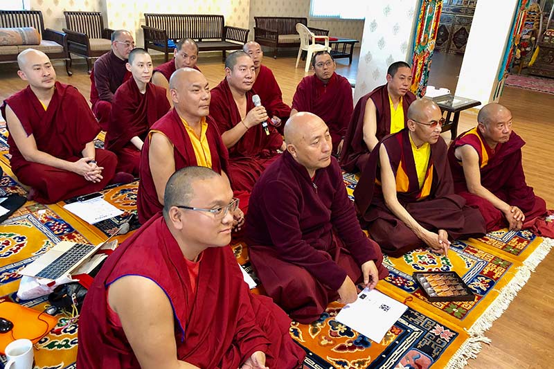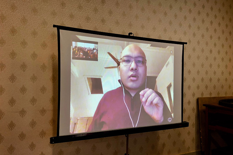 རྒྱལ་དབང་མཆོག་ནས་བཀའ་བརྒྱུད་སྨོན་ལམ་གྲ་སྒྲིག་ཚོགས་པའི་བརྙན་ཕྲིན་ཚོགས་འདུའི་གཙོ་སྐྱོང་གནང་བཞིན་པ།