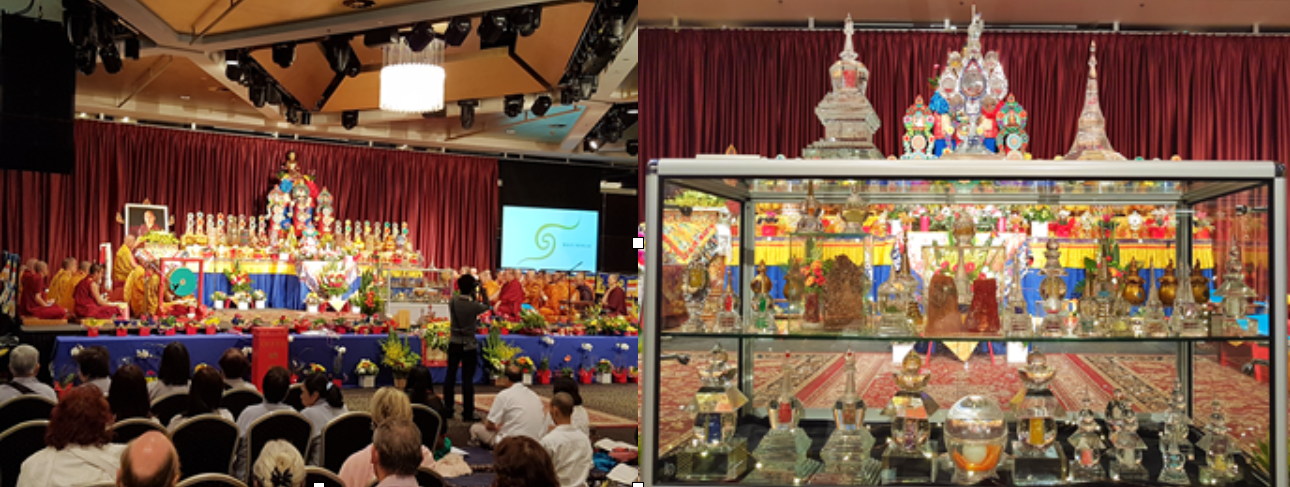 During intermissions, participants and visitors were able to personally offer flowers and make prostrations in front of the precious Buddhist relics enabling individuals to make their karmic connections with the Triple Gem and the Kagyu lineage through veneration. Film screening of (Torma: the ancient art of Tibetan butter sculpture) was shown during the lunch breaks for people to further appreciate Tibetan Buddhist art. Everyone was also given the opportunity to practice generosity which many joyfully contributed at the Tsok offering. After the Ritual Offerings to the Gurus, donors gathered on stage for the Sponsors Appreciation Ceremony and finally the program culminated with everyone chanting the verses of the Lamp Prayer in the Marme Monlam!