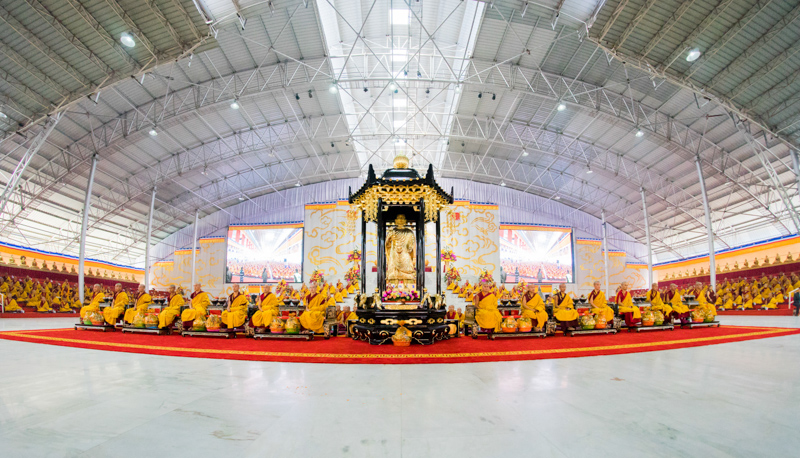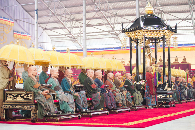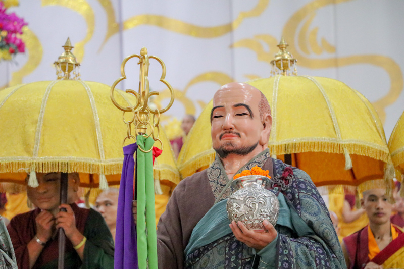羅漢莊嚴靜肅,結手印和持法器加持與會大眾