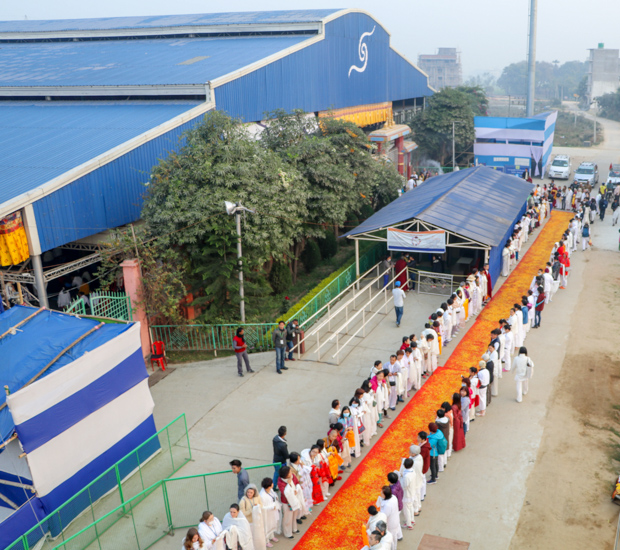 噶舉之友會員在道路兩旁迎接繞巡隊伍,每位會眾都有供養機會