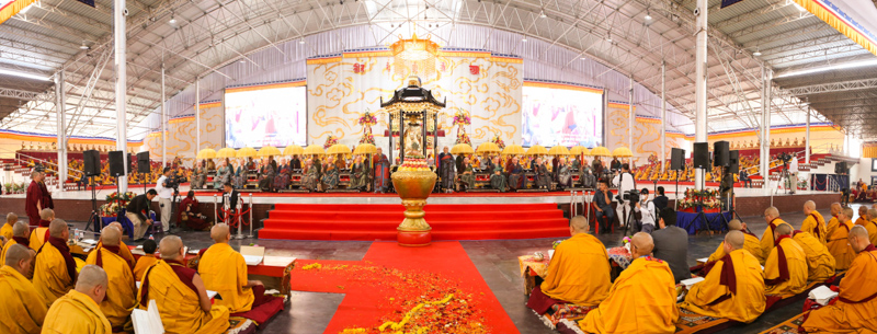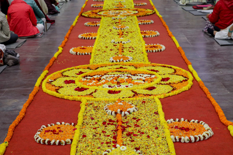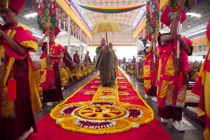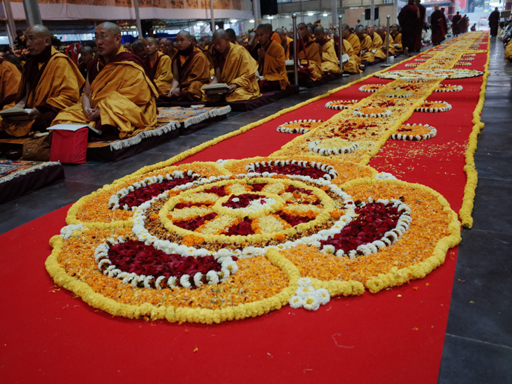 清晨時分,當僧俗四眾們來到大祈願法會現場時,可見到會場已鋪好簇新的紅地毯,上面以紅、白、黃、橘等多色花朵,密密鋪描出法輪、蓮花、雙魚、吉祥結等八吉祥圖案
