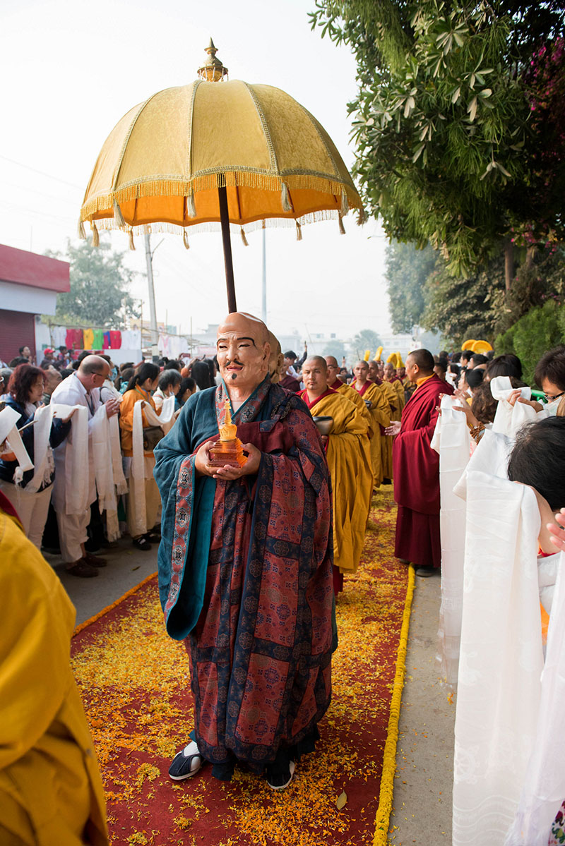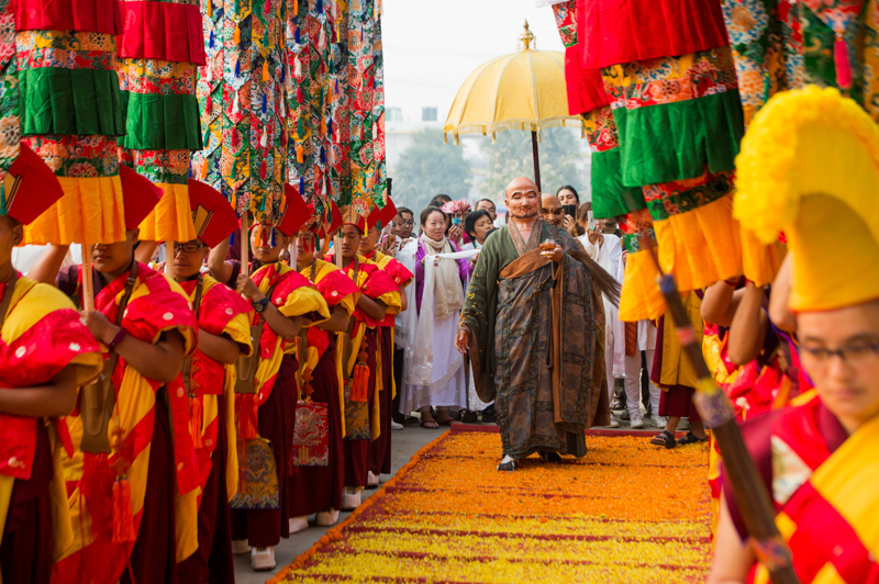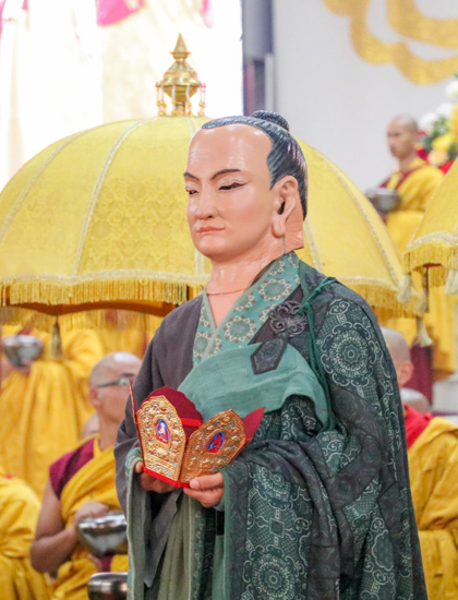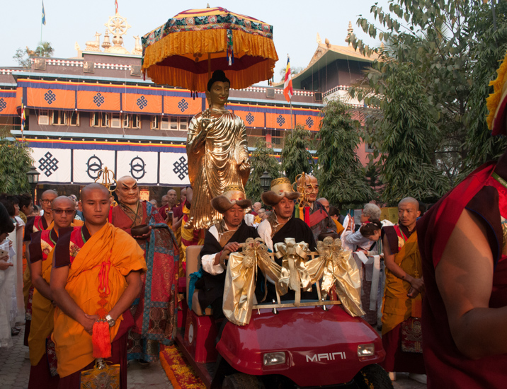 手結施護印、周身金燦的立姿世尊聖像,由電動車緩緩從德噶寺運送至會場