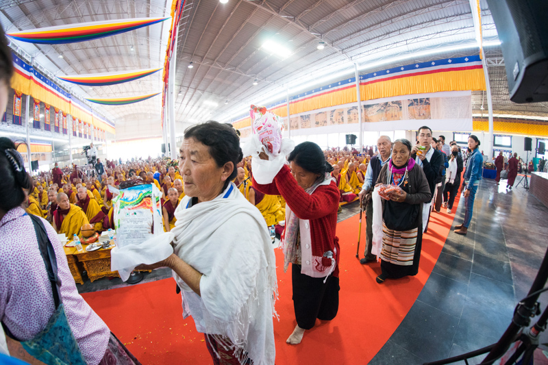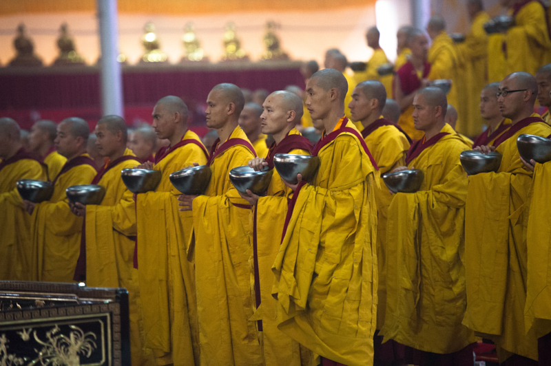 噶舉大祈願法會第六天,舉行十六羅漢繞巡暨托缽儀式。舞台上十六羅漢座位莊嚴羅列,中央是六角亭狀、黑色精雕鍍金的佛龕
