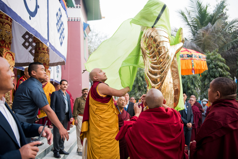 法王揭開這座周身金燦的立姿佛陀聖像,佛像將被供奉於會場舞台中央的六角亭佛龕內