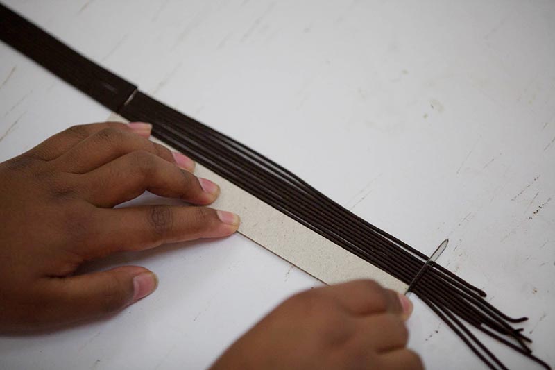 一束束的香分裝入盒,附上標籤說明成份及效益。