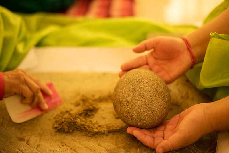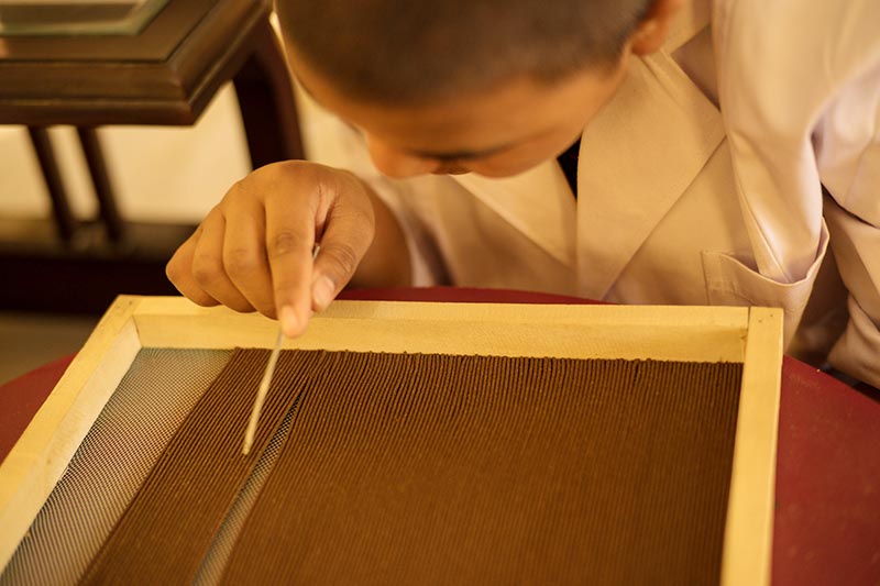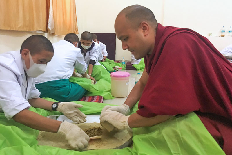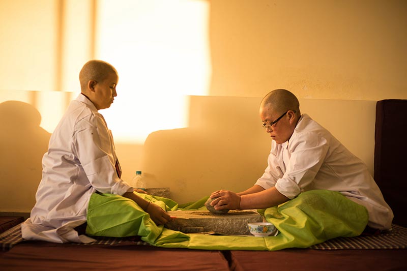 研磨過程完全手工操作:以一塊圓形的大石頭在石面上將材料研搗成粉。這是相當辛苦的體力活,在九天的研磨過程中,許多尼師的手上都起水泡了。