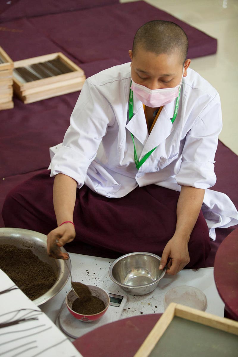 在製作只用最上等自然原料的讖摩香時,尼師的第一項工作是將藥草和一些特殊原料研磨成粉。