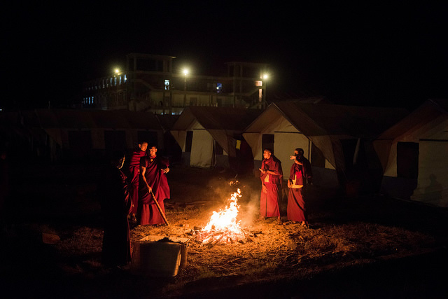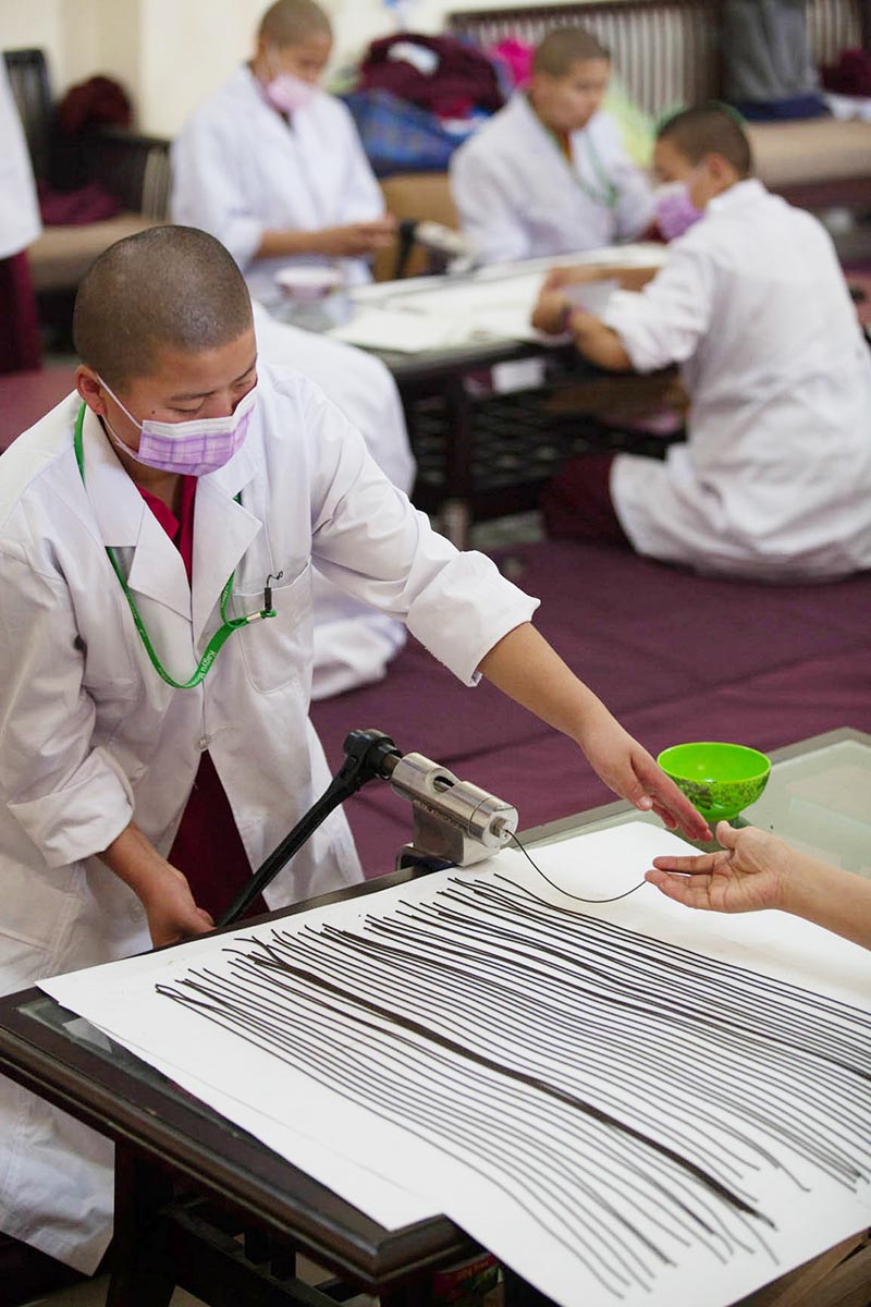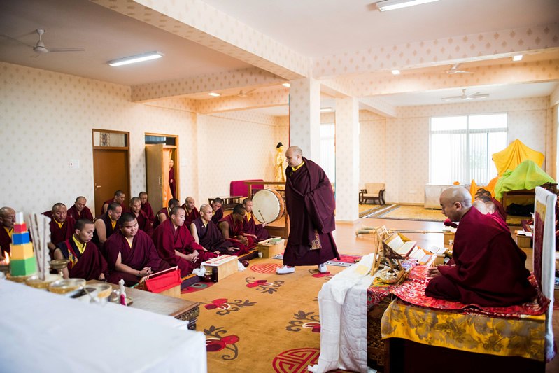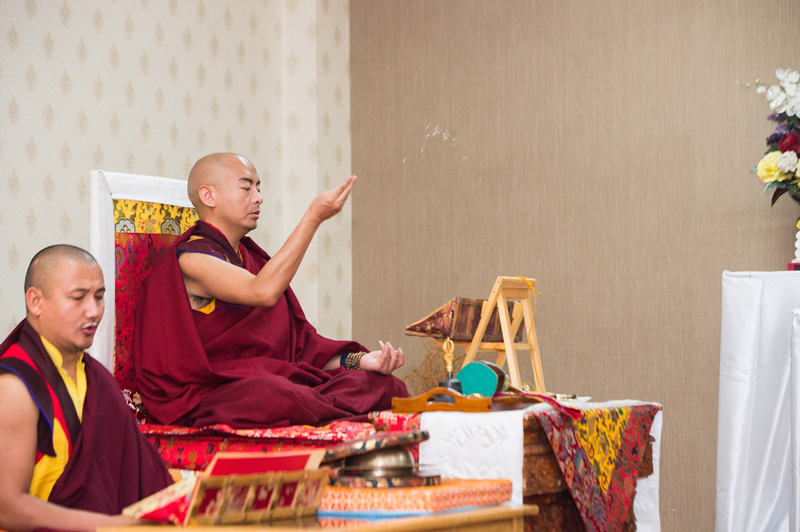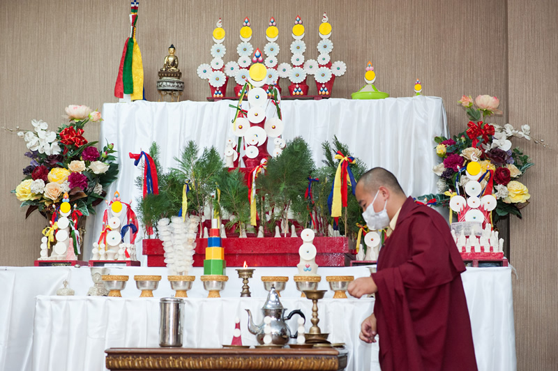 At the elaborate altar, a sharply focused chöpon managed the delicate procedures.