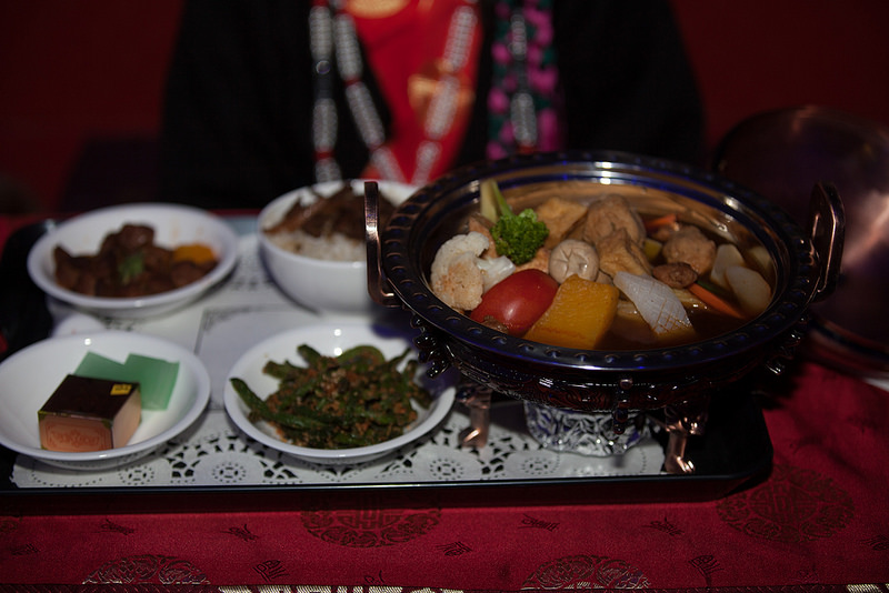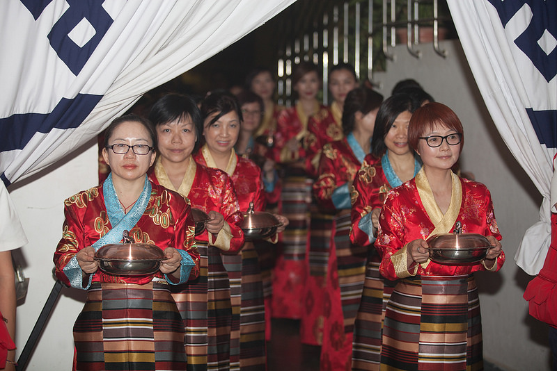 穿著傳統藏服、來自香港噶瑪巴千諾基金會的服務團隊,正要為貴賓上菜。