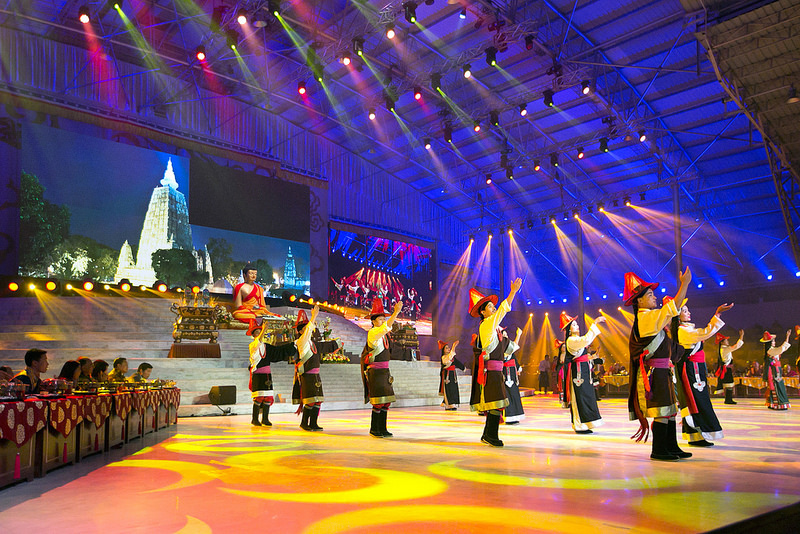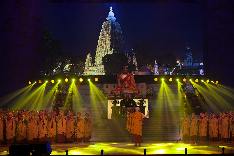 堪布大衛噶瑪確佩(Khenpo David Karma Choephel)指揮「僧尼唱誦團」唱誦藏文版的〈三寶歌〉。背景的中央銀幕投射出正覺大塔,令人更加感念佛陀的恩德和三寶的加被。